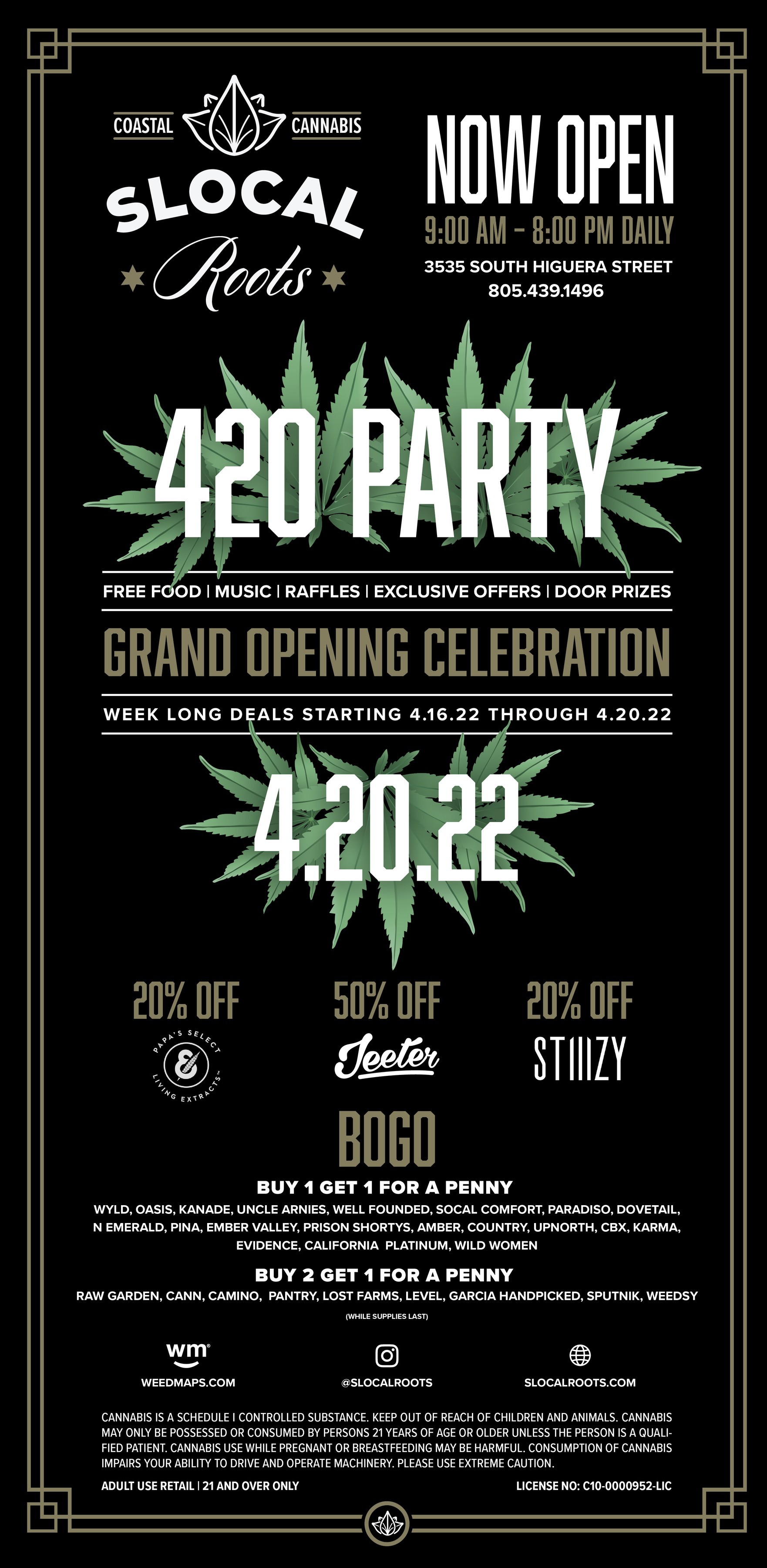 When SLO CAL Roots came to me, they had a name, a vision, and an existing logo. I built everything else. Starting with a horizontal version of the logo, I developed a complete brand system — a new color palette, typography system, original graphics, textures, and patterns. I wrote the brand guidelines and developed the brand voice. Then I built the sub-brand identities: Flash Freeze Kings, Inner Circle, SCR Farms, and Slocal Supply Co. Years later I stepped back in to steward a full rebrand — and helped bring a third retail location, Root One in Guadalupe, from license application to open doors.